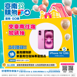 來臺南住宿參加臺南購物節 加碼抽iPhone16手機 【今傳媒/記者許玉枝報導】臺南購物節累積消費登錄金額突破41億,為鼓勵民眾踴躍登錄消費金額,活動祭出「來臺南住宿抽手機」,自1月20日至2月15日,民眾只要來臺南住宿就有機會抽到IPhone16,共有5個專屬臺南旅宿消費的幸運得主。此外,鼓勵會員回娘家,加碼抽出YAMAHA電動機車一台,等於購物節一個抽獎序號就有3次中獎機...... [閱讀更多]
