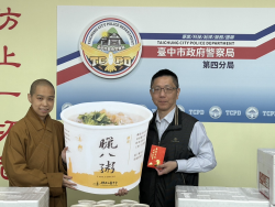 【今傳媒記者王于誠 報導】 歲末年終將至,佛光山惠中寺如瑄法師於1月3日一早率護法師兄、師姊親臨臺中市第四警分局贈300碗臘八粥給全體員警,由分局長陳祥麟代表受贈。慶祝法寶節結緣臘八粥活動已實行多年從未間斷,對於惠中寺而言,在每一年的初始即有美好的開始,透過贈粥儀式,傳遞今年「向前有路、光明在望」的祈福語,讓品嘗臘八粥的每一個人能蒙佛陀加持而福慧成長。此外,隨贈的結緣小...... [閱讀更多]