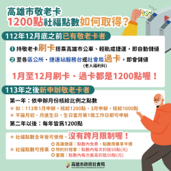 【今傳媒/記者李祖東報導】近日高雄市政府社會局接獲民眾詢問,有關社群媒體轉傳「如果你有滿65歲設籍高雄市者,有辦的敬老捷運卡者,記得在新年1月1日到31日前,必須去坐捷運或輕軌,過卡嗶一聲,就會自動儲值1200元儲值金哦!」是否為真。社會局澄清該資訊為錯誤,請大家不要再轉傳。 社會局表示,為鼓勵長輩外出社會參與,高雄市敬老卡自113年1月1日起,除維持免費搭乘高雄市公車...... [閱讀更多]