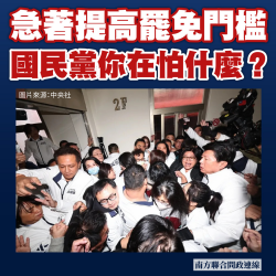【今傳媒/記者李祖東報導】今(16)立法院內政委員會三度排審提高罷免門檻的「選罷法修正草案」,國民黨與民眾黨聯手操作,以不正當手段修改選罷法,限制民眾罷免權。對此,南方聯合問政連線成員,高雄市議員簡煥宗、邱俊憲、張勝富、何權峰、湯詠瑜、黃彥毓聯合嚴厲譴責國民黨、民眾黨的行為無疑是讓台灣民主嚴重倒退,顯示出藍白對於民主制度的漠視與對民意的恐懼。 國民黨立委徐欣瑩上午9時前...... [閱讀更多]