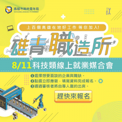 【今傳媒/記者李祖東報導】高雄市政府青年局為協助青年對未來職涯想像更具體、更快踏入職場,與1111人力銀行合作建置「雄青職造所」職缺平台,規劃一系列職涯達人講座、線上媒合面談會,將由明日起陸續辦理3場線上就業媒合會,並於8月19日邀請知名作家謝哲青、暢銷漫畫家擔任一日職涯達人接力開講,傳授創作者如何從不穩定邁向高人氣的心法秘訣,歡迎有興趣的朋友踴躍報名。 青年局局長張以...... [閱讀更多]