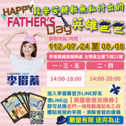 【今傳媒/記者李祖東報導】爸爸們是家庭的堅強後盾,是我們成長路上最值得依靠的支持者。他不求回報,總是默默守護在我們身邊。 在這個特殊的節日裡,李眉蓁特別準備了送給爸爸們的小禮物【金門一條根痠痛貼布】,讓我們一同將心中的感激之情化作一份小小的禮物,獻給辛勤耕耘的爸爸們。 *領取地點:李眉蓁議員服務處(高雄市左營區左營下路21號) *領取日期:112年7月24日(一...... [閱讀更多]