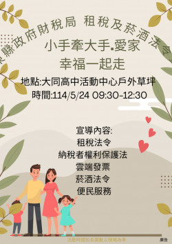 【今傳媒/記者李祖東報導】屏東縣政府財稅局114年5月24日上午930~1200於大同高中活動中心外草坪配合家庭教育中心「小手牽大手.愛家幸福一起走Play together,love forever」活動,設攤辦理各項稅務與菸酒知識、便民服務措施宣導、並進行稅務有獎徵答活動,歡迎大家一同來參加! (屏東縣政府財稅局廣告) 文章導覽 ... [閱讀更多]