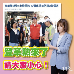 【今傳媒/記者李祖東報導】左楠區立委參選人李眉蓁指出,高雄本土登革熱疫情越來越嚴重,昨天又新增2例病例,分別住在左營區跟湖內區,其中住在左營的男子更是今年高雄首例第二型登革熱的本土個案! 目前高雄的本土登革熱病例已經累計13例,再度提醒各位市民朋友要多多注意預防,記得常常清除積水容器,避免病媒蚊孳生。如果出現發燒、頭痛、後眼窩痛、肌肉關節痛、出疹等疑似症狀,更要儘速就醫...... [閱讀更多]