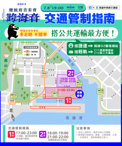 【今傳媒/記者張淑慧 報導】總統府及文化總會共同主辦的「2023總統府音樂會-跨海音」,將於112年7月8日19時在高雄流行音樂中心盛大登場,鹽埕區、五福橋將實施交通管制,會場週邊車位有限,市府呼籲前往民眾搭乘公共運輸,方便又快速! 高市府交通局表示,音樂會當日自17時起至23時止,將依序實施二階段交通管制。第一階段將自17時起管制公園二路(含)以南、大勇路(不含)以...... [閱讀更多]