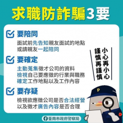 【今傳媒/記者張淑慧 報導】2023臺南市國際龍舟錦標賽於安平運河安億橋至承天橋河段盛大舉行,臺南市政府警察局為擴大犯罪預防宣導效益,運用各局處資源,本次配合體育局龍舟賽事與轄區第四分局共同前往進行反詐騙宣導,向民眾宣導最新詐騙手法及如何預防,現場也提供小朋友們換裝扮演小小警察並設置小小警車體驗區,達到寓教於樂之目標並拉近民眾與市警局的距離。目前正值暑假期間,為青少年打工、...... [閱讀更多]