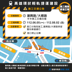【今傳媒/記者李祖東報導】「高雄環狀輕軌捷運建設(第二階段)統包工程」原定6月2日起開始封閉大順二路與覺民路口進行施工,考量替代道路九如路整體車流衝擊影響,延後封閉大順/覺民路口,改優先施作建興路/大順路口過路段軌道主體工程,工程採半半施工交維,第一階段交維改道施工期程自6月5日至8月2日,共計59天,建興路/大順路仍保留東西雙向車道通行,請駕駛人行經施工路段時務必依循交維...... [閱讀更多]