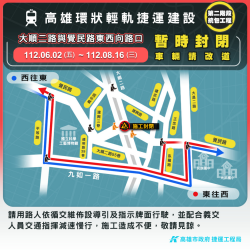 【今傳媒/記者李祖東報導】「高雄環狀輕軌捷運建設(第二階段)統包工程」預計6月2日起開始封閉大順二路與覺民路口進行施工,預計施作該路口過路段軌道主體工程,封閉施工期程至8月16日,共計76天,施工完成後將恢復現有交通設施及車道通行。 捷運工程局指出,大順二路與覺民路口封閉施工期間,仍維持大順二路車輛通行,大順路口與覺民路東西向則禁止車輛通行,建議用路人可提前改道行駛(建...... [閱讀更多]