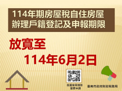 【今傳媒/記者許玉枝報導】房屋稅差別稅率2.0新制(下稱2.0新制)自113年7月起實施,今(114)年5月開徵的房屋稅首次適用,2.0新制增訂自住房屋應辦理戶籍登記之要件,原本今年設戶籍及申報期限截止日為3月24日,財政部考量今年是修法後第1年適用,為維護民眾權益,放寬自住房屋辦理戶籍登記及申報期限至114年6月2日。臺南市政府財政稅務局表示,2.0新制自住房屋除原規定無出租、...... [閱讀更多]