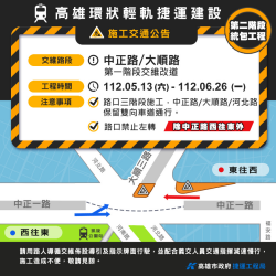 【今傳媒/記者李祖東報導】為配合「高雄環狀輕軌捷運建設(第二階段)統包工程」施工,中正/大順路口規劃三階段交通維持施工,自112年5月13日上午9時起至112年6月26日進行第一階段交通維持改道作業。本次交維設施範圍為中正路/大順路交叉路口,請駕駛人行經施工路段時務必依循交維佈設導引及指示牌面行駛。 高雄市政府捷運工程局表示,為維護施工區域行車安全與順暢,輕軌施工期間大...... [閱讀更多]
