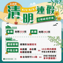 ▲清明節交通疏運。(圖/記者謝榮浤翻攝) 【今傳媒/記者謝榮浤報導】 今年清明節連續假期4月1日至4月5日共計5天,民眾出遊、掃墓將湧現車潮,台中市政府規劃疏導措施提早因應,交通局長葉昭甫表示,從今年連假期間的台中市高快速公路交通車流分析,國1豐原至大雅路段易塞車,建議市民朋友開車上路改走台74接國4,避開易壅塞路段,鼓勵多搭乘公共運輸安心旅遊,減少陷入車陣的困擾。 ...... [閱讀更多]