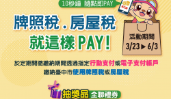 【今傳媒/記者謝榮浤報導】 行動支付及電子支付帳戶繳稅方便又快速,只要10秒鐘,隨點即PAY!為鼓勵民眾多多使用,台中市政府地方稅務局即日起至6月3日,推出「牌照稅.房屋稅 就這樣PAY」活動,只要於開徵繳納期限內以指定行動支付或電子支付帳戶繳納台中市使用牌照稅或房屋稅,就有機會獲得1萬元電子禮券! 地稅局表示,現在繳稅管道多元,其中以使用行動支付及電子支付帳...... [閱讀更多]