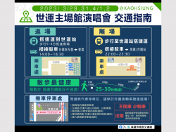 【今傳媒/記者蔡學民報導】天團五月天將自3月29日起接續於高雄世運主場館開唱,除維持世運大道全段封閉管制、捷運加密班次及免費接駁車等原有措施外,另更將增設軍校路公車專用道,預估約2小時可完成散場疏運。交通局提醒「多搭車、多走路、不開車」,歌迷們請搭乘捷運、接駁車或步行前往、避免塞車或尋找車位延誤入場時間。 配合五月天演唱會於3月29日、3月31日、4月1日、4月2日於...... [閱讀更多]