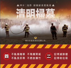 【今傳媒/記者謝榮浤報導】 清明連假將近,中市府與消防局持續宣導,提醒民眾在掃墓時切記「4不2記得」要訣,「不」任意燒雜草、「不」隨意丟煙蒂、「不」讓冥紙飛揚、「不」放爆竹煙火,以及「記得」撲滅餘燼、「記得」隨手收拾垃圾。此外,消防局加強派員到各大公墓巡邏,也會在假日與義消人員、婦宣姐妹一同發放小水袋及宣導單給市民;另提醒民眾記得撲滅餘燼,甚至是不用火,將紙錢集中到環保...... [閱讀更多]