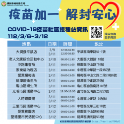 全民「疫苗加一」 桃開設接種站 【今傳媒/記者簡勻青報導】疫情解封之際,桃園衛生局為響應「疫苗加一,解封安心」運動,提醒凡「未曾接種任何一劑」、「尚未完成基礎劑」及「6歲以上於今年1月1日起未接種過莫德納BA.4/5次世代疫苗」等對象儘快接種,增強自我防護力,衛生局也持續開設莫德納次世代雙價BA.4/5疫苗免預約接種站,提供方便快速的疫苗接種服務,呼籲符合接種資格民眾,...... [閱讀更多]