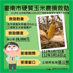 【今傳媒/記者張淑慧 報導】台南市硬質玉米的生育期間受到多方面的影響,包括高溫、缺水、低溫等因素,導致產量偏低。經農委會調查,台南市全區均符合農業天然災害標準,故政府在3月6日公佈,台南市全市為硬質玉米農業天然災害現金救助及低利貸款地區。 農委會表示,符合資格的農民每公頃可獲得2萬8,000元的救助金,申請期間為3月7日至3月16日。凡符合申請資格的農戶,請攜帶「身分證、印章...... [閱讀更多]