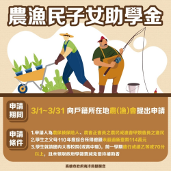 【今傳媒/記者李祖東報導】行政院農業委員會112年度農漁民子女助學金3月1日開始受理申請,針對農漁民子女就讀高中職、大學,給予新臺幣4,000至1萬3,000元不等助學金,受理期限至112年3月31日止,請符合資格的農漁民朋友把握時間向戶籍所在地農(漁)會申請。 高雄市政府海洋局表示,政府為落實照顧農漁民政策,每年3月1日~31日及9月16日~10月15日辦理助學金受理...... [閱讀更多]