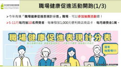 根據衛福部國健署調查顯示,近8成職場員工蔬果攝取不足,近5成運動量未達世界衛生組織(WHO)建議標準。為促進職場安全與健康,5月1日勞動節前,國健署舉辦「健康職場動吃動」記者會,希望推動職場健康促進。 而國健署也舉辦了3項職場健康促進活動。其中,各行業大中小型職場之健康促進推動人員,今年若有填寫「職場健康促進表現計分表」,可以參加抽獎活動,有機會獲得1,000元便利商店商品卡,每月...... [閱讀更多]