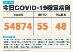 中央流行疫情指揮中心今(5)日公布國內新增54,929例COVID-19確定病例,分別為54,874例本土個案及55例境外移入;另確診個案中新增48例死亡。 指揮中心表示,今日新增之54,874例本土病例,為25,473例男性、29,380例女性、21例調查中,年齡介於未滿5歲至90多歲以上,個案分佈為新北市(11,234例),臺中市(7,018例),臺北市(6,351例),...... [閱讀更多]