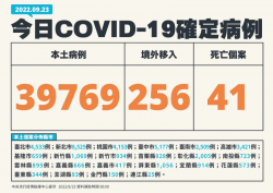 中央流行疫情指揮中心今(23)日公布國內新增40,025例COVID-19確定病例,分別為39,769例本土個案及256例境外移入;另確診個案中新增41例死亡。 指揮中心表示,今日新增之39,769例本土病例,為18,246例男性、21,503例女性、20例調查中,年齡介於未滿5歲至90多歲以上,個案分佈為新北市(8,525例),臺中市(5,177例),臺北市(4,533例)...... [閱讀更多]