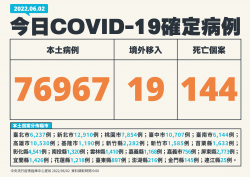 中央流行疫情指揮中心今(2)日公布國內新增76,986例COVID-19確定病例,分別為76,967例本土個案及19例境外移入;另確診個案中新增144例死亡。 指揮中心表示,今日新增之76,967例本土病例,為36,441例男性、40,500例女性、26例調查中,年齡介於未滿5歲至90歲以上。 個案縣市分佈 新北市12,910例 臺中市10,707例 高...... [閱讀更多]