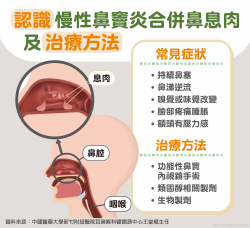 新冠肺炎疫情延燒,國人對於流鼻水、鼻塞、嗅覺異常等呼吸道症狀提心吊膽,如果快篩結果為陰性。耳鼻喉科醫師表示,民眾也需要留心是否罹患其他呼吸道疾病,比如慢性鼻竇炎合併鼻息肉,這類疾病如果長期置之不理,恐增加中耳炎和睡眠呼吸中止等共病風險。 慢性鼻竇炎合併鼻息肉症狀:鼻塞、流鼻水、嗅覺異常 中國醫藥大學新竹附設醫院耳鼻喉科暨聽語中心王堂權主任表示,慢性鼻竇炎是一個嚴重影響生活品質的...... [閱讀更多]