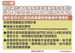 指揮中心表示,為使具重症風險因子且有使用Paxlovid口服抗病毒藥物需求之輕中症COVID-19確診病人及時獲得治療,指揮中心宣布,自今(2022)年5月13日起,開放符合口服抗病毒藥物用藥條件之COVID-19確診者,可由親友代為看診,以評估使用口服抗病毒藥物。 親友可持確診者健保卡、確診證明 代為看診、領藥 指揮中心指出,符合口服抗病毒藥物用藥條件之COVID-19確診者...... [閱讀更多]