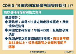 中央流行疫情指揮中心今(4/8)日表示,為持續推動「新台灣模式」,達到「正常生活、積極防疫、穩健開放」的目標,指揮中心持續針對確診者進行「重症清零,輕症有效控管」之策略,並訂定「COVID-19確診個案居家照護管理指引」因應無法掌握何時可能大規模爆發的疫情。 確診居家隔離需小於65歲 且無懷孕、沒有洗腎需求 COVID-19確診個案居家照護管理指引中提到:首先,確診者健康條件須...... [閱讀更多]