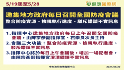 中央流行疫情指揮中心今(20)日表示,已於上午與各縣市政府完成召開第一次「全國防疫會議」。 中央流行疫情指揮中心今(20)日表示,已於上午與各縣市政府完成召開第一次「全國防疫會議」。會議決議如下: 一、請各地方政府儘速盤點熱區採檢站設立事宜,並提報指揮中心評估協助。 二、針對採檢、後送就醫、診療程序及集中檢疫場所設置標準等,請指揮中心相關單...... [閱讀更多]