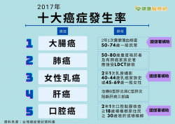 衛生福利部29日公布107年癌症登記報告,新發癌症人數為11萬6,131人,較106年增加4,447人。(製圖:黃心瑩) 衛生福利部29日公布107年癌症登記報告,新發癌症人數為11萬6,131人,較106年增加4,447人。107年平均每4分31秒1人罹癌,比106年快轉11秒。十大癌症前三名為,大腸癌、肺癌、女性乳癌。 檳榔、菸、九三項皆有 ...... [閱讀更多]