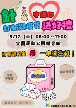 (圖/宜蘭縣府衛生局) 新冠疫情再度進入流行期,全國新冠門急診就診人次已連續五週上升;衛生福利部疾病管制署表示,新冠肺炎已經進入第7波Omicron疫情,目前預期疫情應於5到6月進入高峰。宜蘭縣除了61家合約醫療院所可提供新冠JN.1疫苗接種服務外,宜蘭縣府衛生局另安排於5月17日(星期六)上午8時至11時於宜蘭縣立體育館提供JN.1免費接種服務,請尚未接種新...... [閱讀更多]