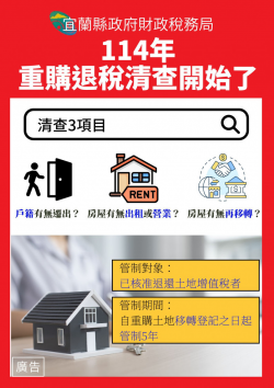 (圖/宜蘭縣府財政稅務局) 宜蘭縣政府財政稅務局表示,自5月1日起已經開始對重購自用住宅用地已核准退還土地增值稅案件辦理清查作業,清查時間將持續到10月底! 為杜絕退稅後,土地所有權人即將另購土地出售,或轉作其他用途,宜縣府財稅局說明,不論先賣後買或先買後賣自用住宅用地,凡是已申請並核准退還出售時繳納的土地增值稅,自重購土地移轉登記之日起到目前,仍在5年列...... [閱讀更多]