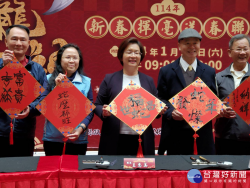 小龍納百福迎新年,名家揮毫送春聯。圖/記者鄧富珍攝 彰化縣政府為迎接114年農曆新春佳節,今(11)日上午舉辦「小龍納百福-新春揮毫送春聯」活動,由彰化縣長王惠美、文化局長張雀芬、各書法學會理事長共同開筆儀式,送上新春賀詞,王縣長寫下「福蛇昌世」,於歲末同慶迎接即將來到的蛇年,祝福所有鄉親新年快樂、福氣滿滿,迎接即將到來的金蛇年。 小龍納百福迎新年,...... [閱讀更多]
