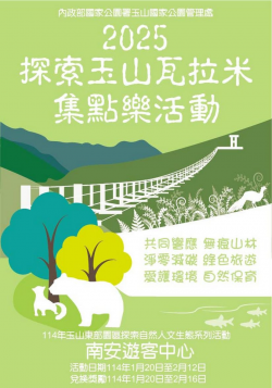 玉山國家公園管理處八通關越嶺道東段-瓦拉米步道是民眾親近玉山國家公園的好去處,而南安部落田園景觀更是近年來到訪遊客讚賞的美麗風景,吸引不少遊客到此佇足。為推廣玉管處在瓦拉米步道的自然生態、認識玉山東部園區,南安遊客中心於今(114)年寒假期間辦理『玉山東部園區~探索自然人文生態系列』活動,歡迎來訪遊客一起來認識園區野生動植物、踏訪八通關越道路人文歷史 、欣賞南安田園...... [閱讀更多]