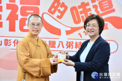 佛光山彰化福山寺「臘八粥」予縣府府內各單位同仁分享結緣,王惠美縣長亦回贈結緣禮品,感謝佛光山福山寺對社會公益的付出。圖/記者鄧富珍攝 為提前恭迎農曆12月8日釋迦牟尼佛成道日「法寶節」到來,廣邀社會各界同霑法喜,佛光山彰化福山寺住持妙宥法師及國際佛光會中區協會副會長黃修鈺等人,於今(3)日上午前往彰化縣政府拜訪王惠美縣長,佛光山彰化福山寺並贈送「臘八粥」予縣府...... [閱讀更多]