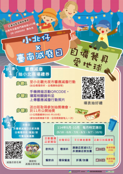 將環保理念落實在日常消費中,臺南市環保局攜手小北觀光夜市(又稱小北商場)舉辦「小北仔永續夜・環保新食尚」活動,結合店家推動內用餐具補助、自備優惠及減廢宣導等多項措施,打造綠色消費新風潮。透過小北仔帶動、民眾響應,讓減塑行動走入市民生活,打造更友善環境的消費模式。 活動自5月起至10月為期6個月,凡在小北仔減廢店家自備環保餐具(含餐盒、碗、杯)或購物袋消費,即可享...... [閱讀更多]