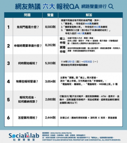每年5月是台灣的報稅季節,隨著2025年所得稅新制上路,不少首度報稅的民眾對於免稅門檻變動、申報方式及繳稅流程感到「霧煞煞」。本次我們便針對「報稅問題」進行觀測,歸納出六大最常被問到的報稅問題,一起來看看這些疑問的解答吧! 《Social Lab社群實驗室》本次透過《OpView社群口碑資料庫》追蹤近三個月內「報稅QA」相關話題的網路聲量,帶您了解網友熱議的報稅...... [閱讀更多]