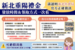 已辦妥重陽禮金匯款者免重複申請 領取現金者新北社會局會主動通知