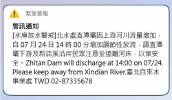 (圖/台北自來水事業處) 因凱米颱風來襲,其外圍環流影響、上遊河川流量增加,台北自來水事業處為調節水壩水位,從今(24)日早上起就執行直潭壩、青潭堰及雙溪水壩的調節性放流措施。近幾個小時因新店溪上遊河川流量增加,北水處宣布從14時起增加至每秒約500立方公尺調節性放流,並視上遊河川流量狀況適時調整放流量。北水處也已發布「水庫放水警戒」細胞廣播,請直潭壩下游、新...... [閱讀更多]