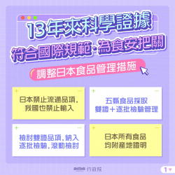 (圖/翻攝自衛福部食藥署Facebook) 針對2011年3月11日東日本大地震以後,日本福島、茨城、栃木、群馬、千葉等5縣食品進口議題,我政府從2022年起,就已開放上述5縣食品輸入但少部分品項至今仍禁止輸入。今(23)日衛福部預告,將全面解除日本福島等5縣食品輸入管制,未來野生鳥獸肉、菇類、漉油菜等原禁止品項,採雙證管理加逐批檢驗;而日本禁止流通的品項仍不...... [閱讀更多]