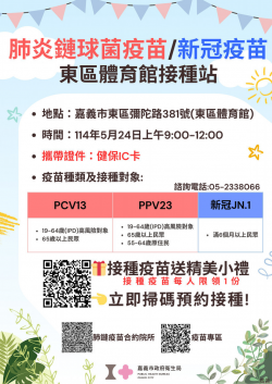 嘉義市政府衛生局於5月24日上午9-12時在東區體育館開設肺炎鏈球菌及新冠JN.1疫苗接種站/衛生局提供 俗稱「老人殺手」的肺炎病例數為近6年來(2020年起)同期新高,另新冠疫情也再度進入流行期,全國新冠門急診就診人次單周增加近8成,已連續四週上升。為守護市民健康,嘉義市政府衛生局於5月24日上午9-12時在東區體育館開設肺炎鏈球菌及新冠JN.1疫苗接種站,...... [閱讀更多]