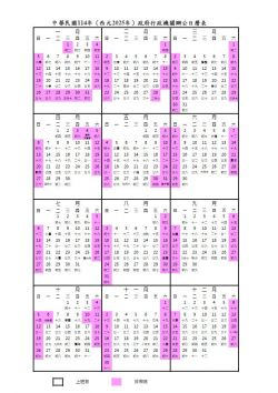 中華民國114年政府行政機關辦公日曆表。(圖/資料照片,圖源:翻攝自行政院人事行政總處官網) 立法院院會今(9)日審查《紀念日及節日實施條例》,在中國國民黨、台灣民眾黨立院黨團攜手下,該條例三讀通過。待總統公布後,未來除現有假日外,農曆小年夜直接放假不用再補班課;5月1日勞動節改成為全國放假;9月28日教師節、10月25日台灣光復暨古寧頭大捷紀念日、12月25...... [閱讀更多]