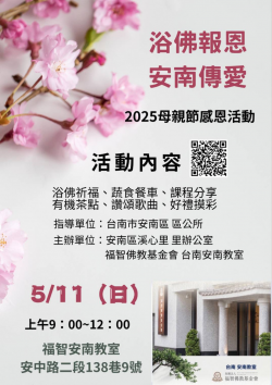 福智佛教基金會臺南安南教室將於5月11日(日)上午9-12點,舉辦「浴佛報恩.安南傳愛」母親節慶祝活動。活動結合社區互動與浴佛儀式,讓參與者親近佛菩薩,祈願身心安康,也表達對母親的感恩之情。 現場設有健康飲食、有機農業、智慧護生等展覽,以及推廣健康飲食理念的養生蔬食餐車,同時也能欣賞讚頌音樂、聆聽生命教育影片、享用清淨茶點等豐富多元的內容,全程參與還可獲得摸彩券...... [閱讀更多]
