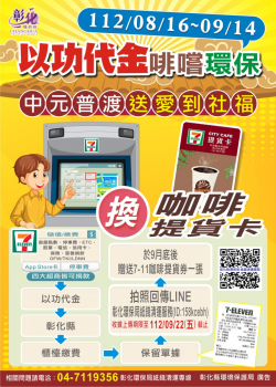 「中元普渡送愛到社福 以功代金啡嚐環保」活動,自8月16日起至9月14日截止。圖/彰化縣政府環保局提供 彰化中元普渡淨零轉型推廣「以功代金」,環保局特規劃於今(112)年中元節期間擴大推廣「中元普渡送愛到社福 以功代金啡嚐環保」活動,只要在8月16日起至9月14日期間前往四大超商以功代金捐款並指定「彰化縣」社福團體,即可憑捐款收據兌換咖啡1杯,減空污做功德一舉...... [閱讀更多]