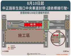 因應捷運施工8/10起中正路新生路口中央車道封閉 請駕駛人放慢車速小心駕駛