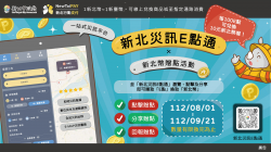 新北市政府今(29)日推出「新北災訊E點通贈送新北幣」活動,民眾凡於活動期間至「新北災訊E點通」網站(https://e.tpf.gov.tw/)瀏覽點擊、分享網頁、災情回報均可累積E點通點數(E點),每集滿100E點即可兌換10元新北幣(等同10元新台幣),新北幣可線上兌換商品或至指定通路消費(含四大超商),活動從即日起至112年9月21日止,新北幣數量有限,要把...... [閱讀更多]