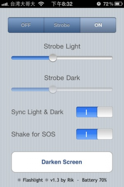 iPhone 4的照相機有閃光燈,也代表說這個閃光燈可以當作照明使用,這的確是黑夜裡面非常實用的一項功能,其實我是過幾款不同的手電筒工具,我覺得有些過於花俏而 不實用,我甚至希望只要按鈕按下去閃光燈就可以直接當照明使用,不過似乎還沒被我翻到這樣的軟體,不過也意外地找到一個很不錯的,雖然說他沒有什麼評價, 但是我覺得功能相當足夠而且實用! 最上排分為三個部分,OFF(關閉)、St...... [閱讀更多]