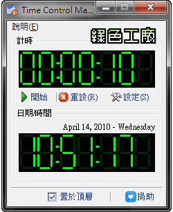 倒數計時是個很普通的功能,大多人的手錶或是手機上都有倒數計時的小功能,反而是最常接觸的電腦沒有這樣的小功能,倒數計時的工具可以有效控制自己時間運用,譬如說上班時跟自己說「在噗浪五分鐘就好!」,或是說「要在30分鐘內完成老闆的任務」,有個時間再倒數好像多了一份動力啊! Time Control Master是一個倒數計時的小工具,小小的一個執行檔不到1MB,倒數的時間可以指定到某...... [閱讀更多]