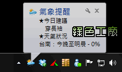 不知道多少人習慣關心氣象?我以前其實都不太注意氣象的,反正天冷就穿衣,下雨就穿雨衣,天氣度我的影響似乎不大,不過開始騎單車之後,就會注意天氣的變化,因為騎車就是要好天氣啦!從此之後要出門都會習慣看一下氣象,不管是不是騎車都是如此。 今天分享一個桌面的小工具,第一次設定好你所在的區域後,每半小時就會提醒你一次最新的氣象狀態,我覺得算是不錯的小工具囉^^ http://...... [閱讀更多]