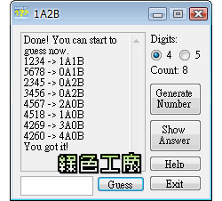 小時候你有玩過猜數字的遊戲嗎?答案為不同的4個數字的排列組合,猜4個不同的數字,若數字與位置相同則為A,若數字相同位置不同則為B,趕快來挑戰自己一下吧! 前陣子不知道怎麼突然想起這個遊戲,我一直都覺得這是個可以動動腦的小遊戲,但是好像很久沒有看到著小遊戲的蹤跡了,於是打算自己開發一個web版,若有時候太無聊就可以殺殺時間囉!老實說我覺得這個遊戲頗適合上班或上課時提神一下,因此介...... [閱讀更多]